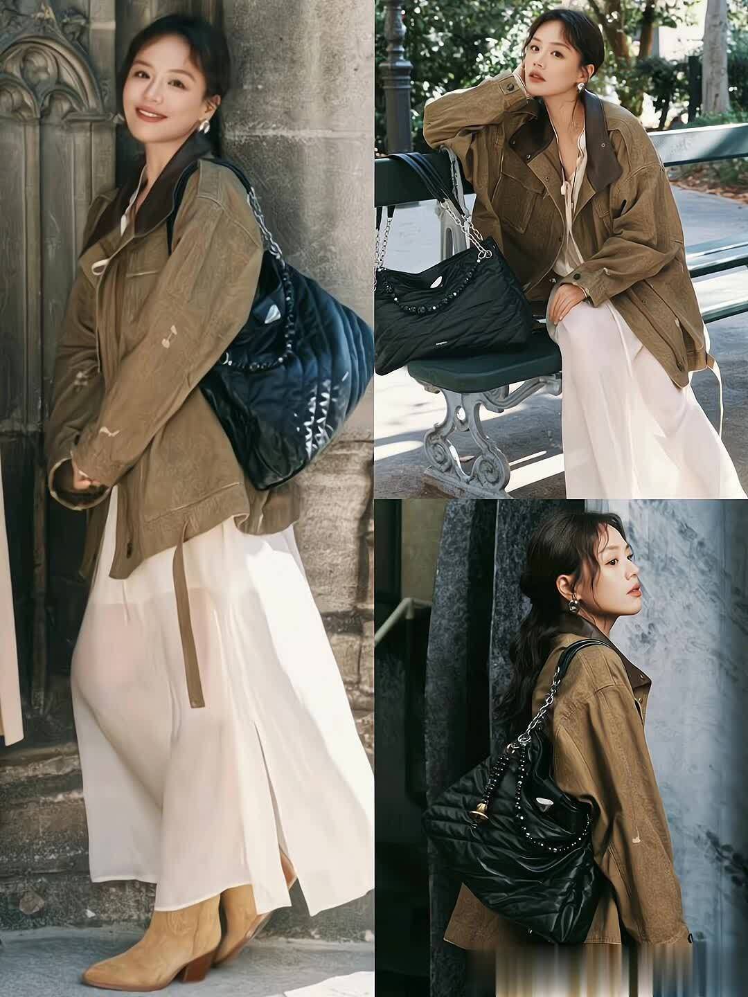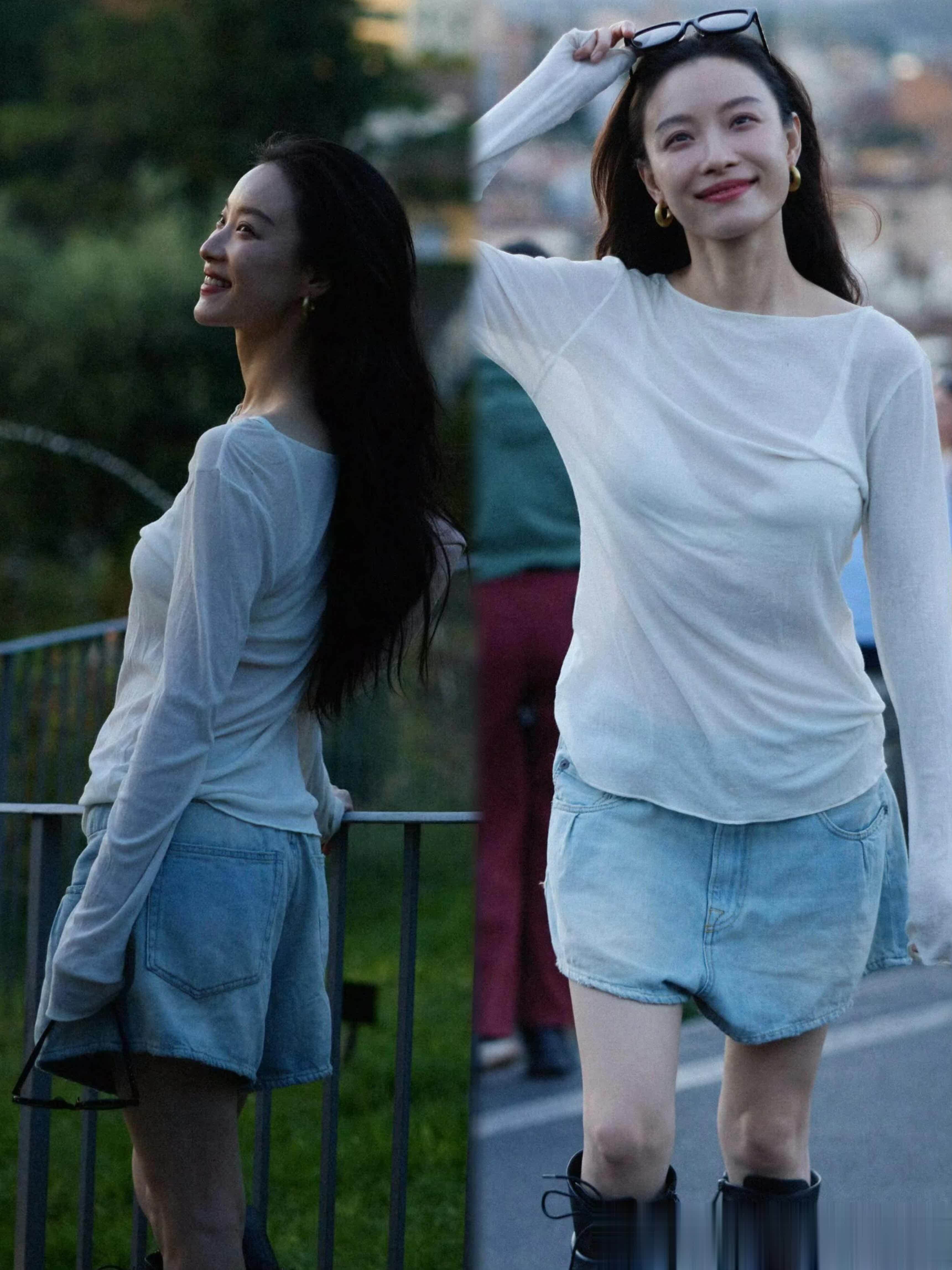 她的旅行照里还有套更绝的:白色衬衫配牛仔阔腿裤,衬衫下摆一半塞进裤子,一半随意垂着,袖子挽到小臂,露出细手链。踩双白色帆布鞋,手里拎个草编包,里面塞着墨镜和口红,坐在海边的礁石上,海风把衬衫吹得鼓鼓的,笑得一脸舒展。没有复杂的配饰,没有花哨的颜色,却把“旅行就该自在”的感觉穿得明明白白,让人看了就想拎起包出发。