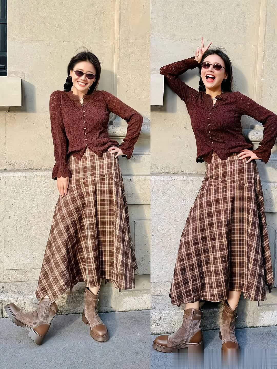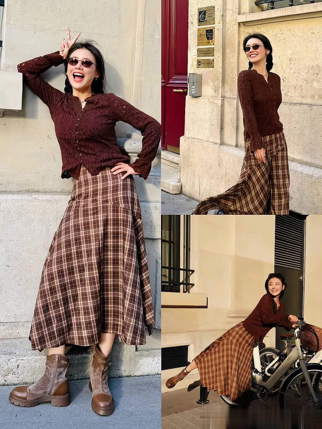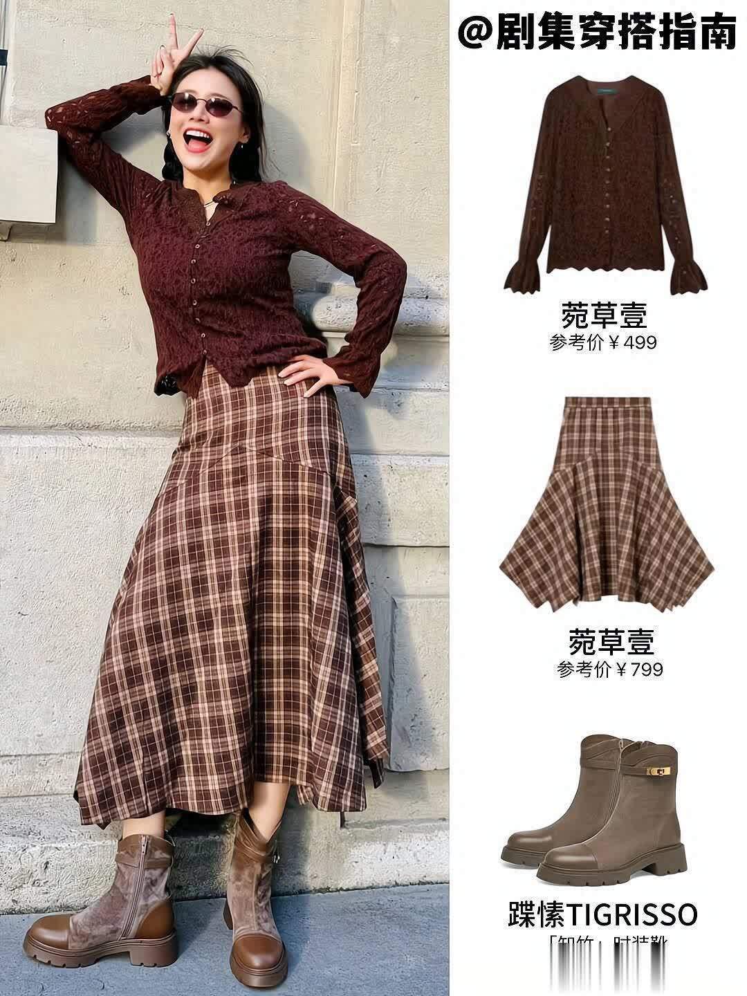 先说说马思纯那身复古搭,简直是“温柔到骨子里”的范本!她穿的那件长袖蕾丝衫太会选了,不是那种扎眼的纯白,带点米杏色的调调,蕾丝花纹细巧得不显俗气,袖口和领口的花边轻轻卷着,透着股低调的精致。底下配的不规则格纹裙更是点睛之笔,咖色和米色的格纹交织,裙摆一边长一边短,走路时轻轻晃,复古味直接拉满。最妙的是那双新中式短靴,棕色皮质带着点哑光感,鞋头圆圆的不生硬,靴筒刚好到脚踝,把格纹裙的边角盖住一点,现代和复古的碰撞特别和谐。她就那么站在老洋房门口,阳光落在蕾丝衫上,绒毛都透着暖光,明明没刻意凹造型,却像�年代的杂志里走出来的,难怪网友说“这才是复古美人该有的样子”~